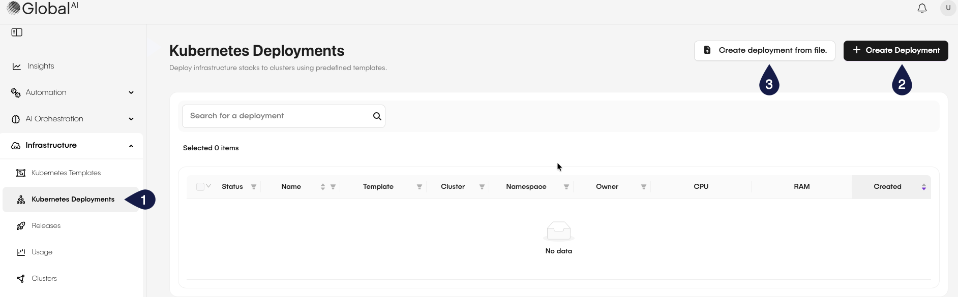 - On the GlobalAI dashboard, navigate to the Kubernetes Deployments section on the sidebar.
